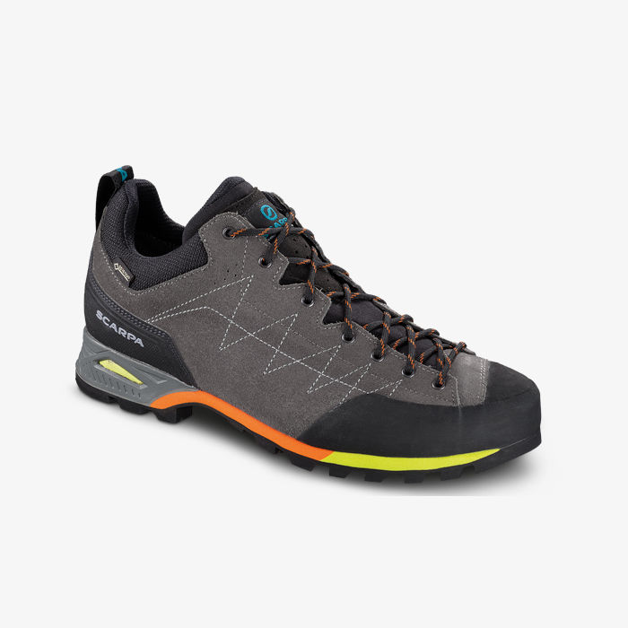 Tomaia ideata con sistema costruttivo Sock-Fit DVL by SCARPA® e fodera in Gore-Tex® che garantisce impermeabilità e traspirazione al piede. L’allacciatura fino in punta permette una calzata personalizzata e garantisce estrema precisione sugli appoggi e massima agilità. Suola Drumlin con intersuola composto da un tacco di sostegno in PU e un inserto in EVA a bassa densità che aiuta ad attutire gli impatti col terreno in fase di camminata. Il battistrada con dentatura pronunciata e climbing zone frontale in gomma Vibram® aumentano il grip anche sui terreni più impervi.